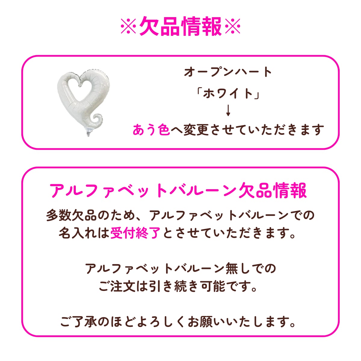 多数の文字が欠品となっておりますため、アルファベットバルーンでの名入れは受付終了とさせていただきます。
